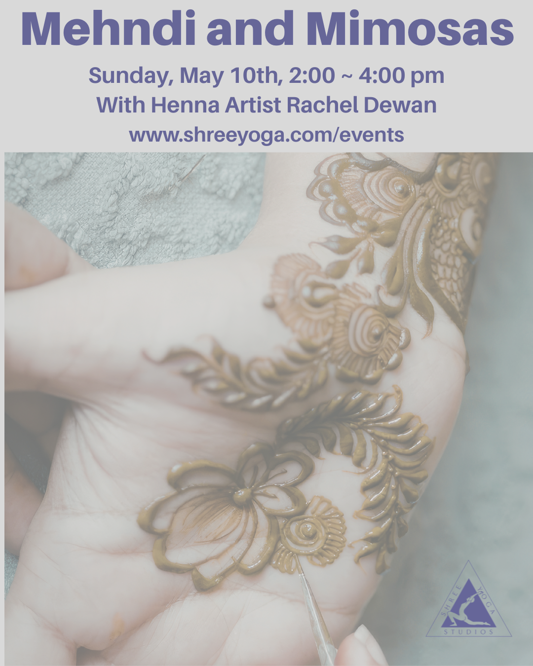 Mehndi is the oldest form of body art still in existence today. A paste containing a plant-based dye created from the henna tree is used to decorate the body with a temporary tattoo that lasts 1 – 2 weeks. Email Rachel with questions: Rachel@shreeyoga.com
